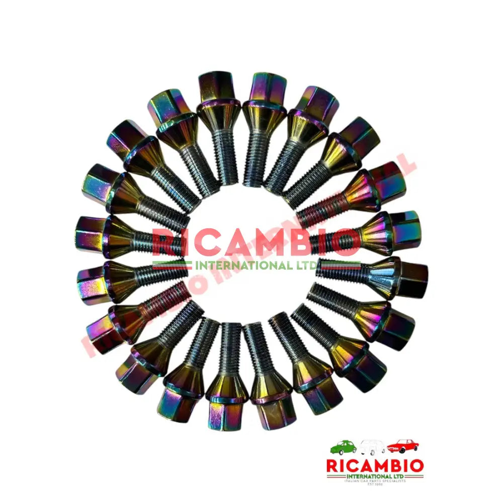 This is a set of 20 wheel bolts finished in a Oil Slick colour